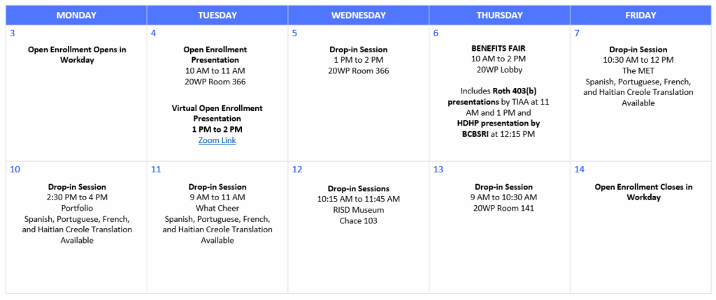 Below is a schedule of events that provide opportunities for you to learn more about the 2026 benefits being offered by RISD.